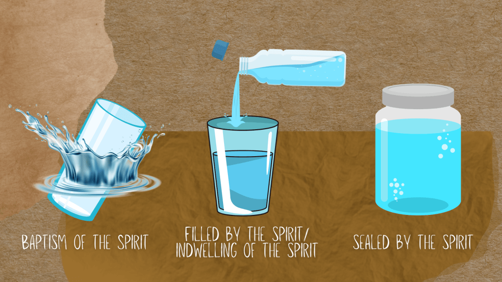 - Spirit indwelling in us. 1 Corinthians 6:19, “Or do you not know that your body is a temple of the Holy Spirit within you, whom you have from God? You are not your own, 20 you were bought at a price. Therefore honor God with your bodies.” Romans 8:14-17, “14 For those who are led by the Spirit of God are the children of God. 15 The Spirit you received does not make you slaves, so that you live in fear again; rather, the Spirit you received brought about your adoption to sonship. And by him we cry, “Abba, Father.” 16 The Spirit himself testifies with our spirit that we are God’s children. 17 Now if we are children, then we are heirs—heirs of God and co-heirs with Christ, if indeed we share in his sufferings in order that we may also share in his glory.” (Filled – Eph 5:18)